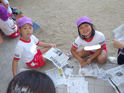 NちゃんとSちゃんは食べるときに使う新聞紙を準備してくれていました。