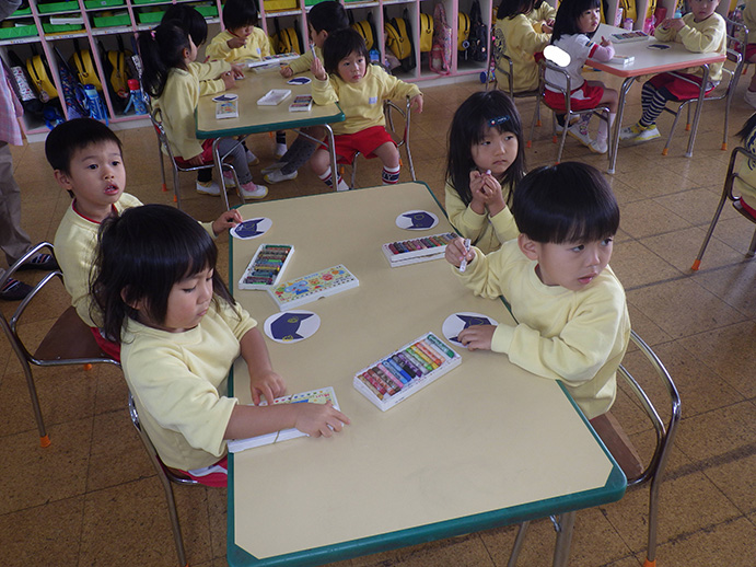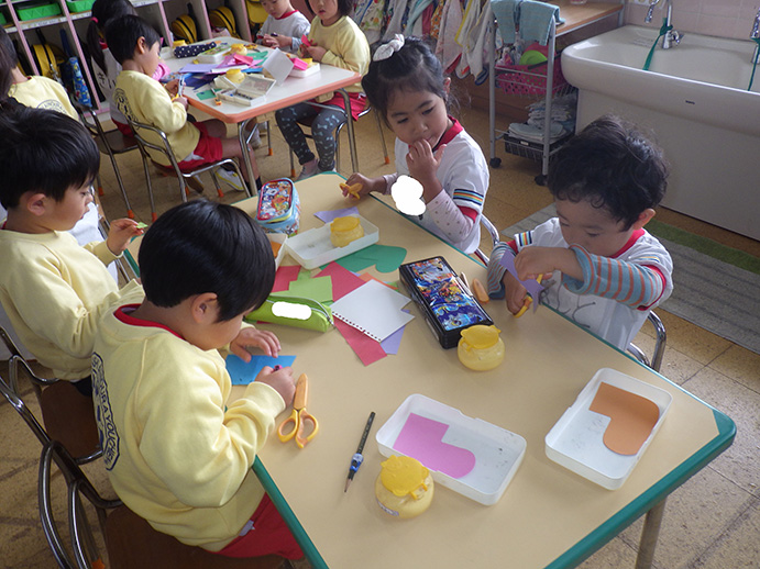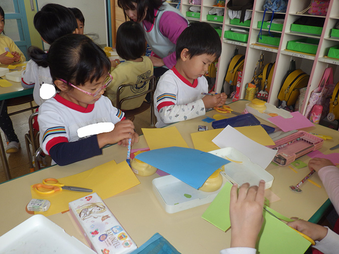 自分で画用紙に形を描いて、はさみでチョキチョキ。