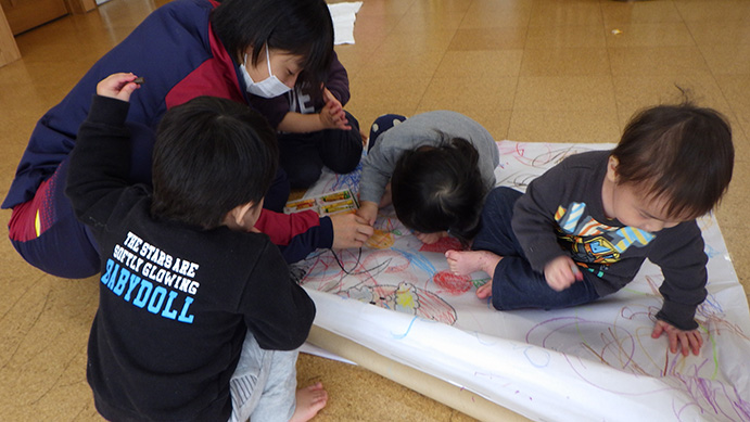 その後は大きな紙にみんなで自由画を描きました。