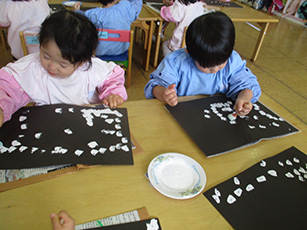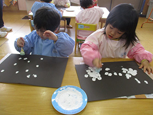 画用紙いっぱいにスタンプをして、雪を表現しましたよ。