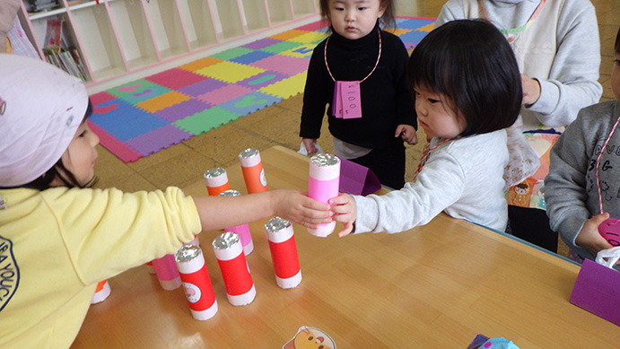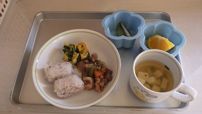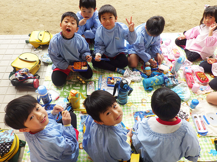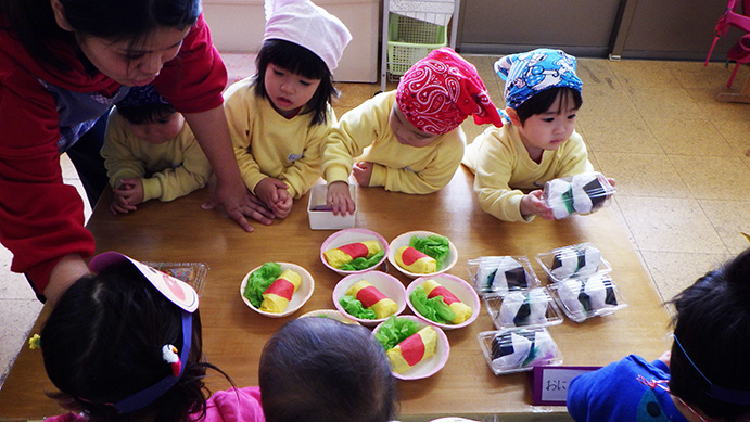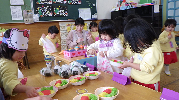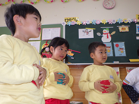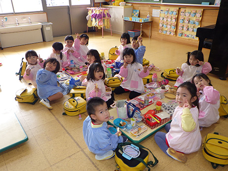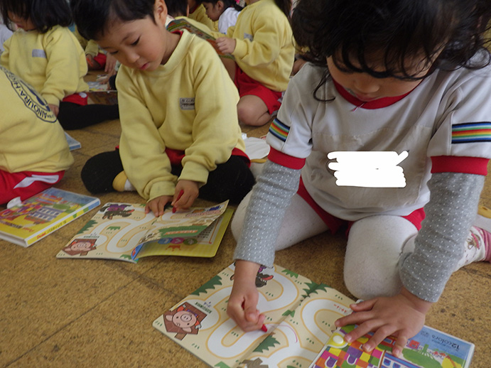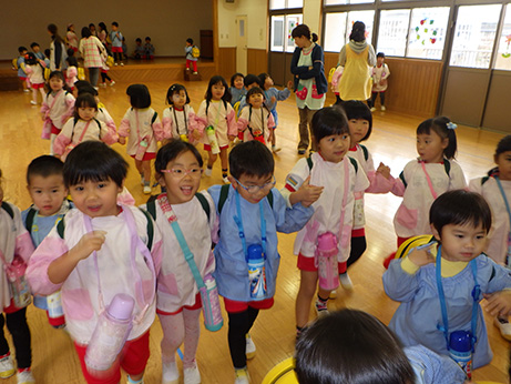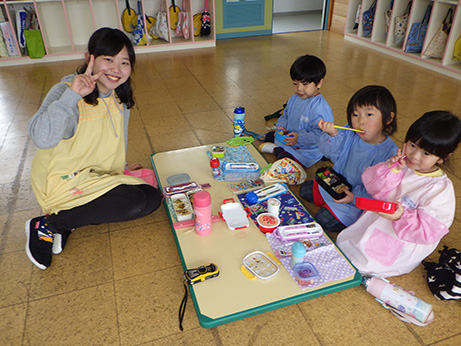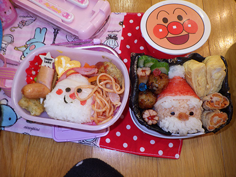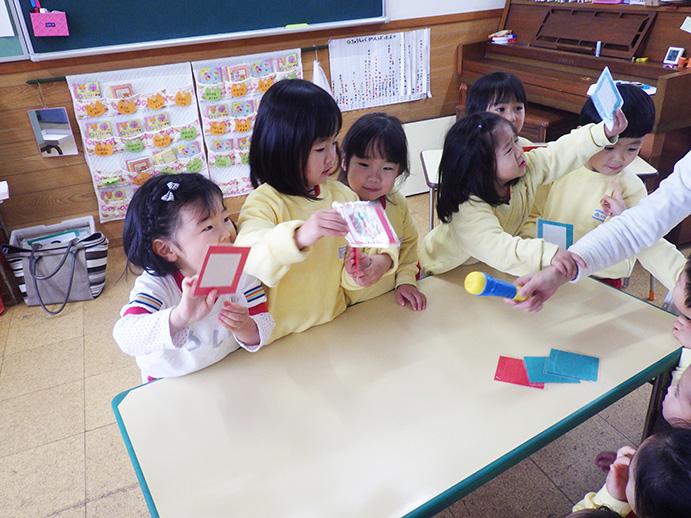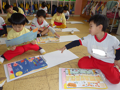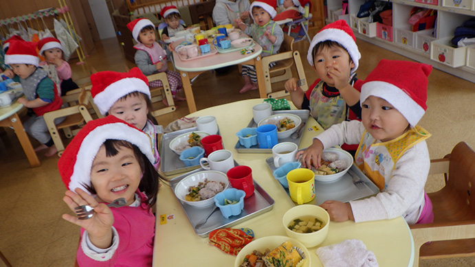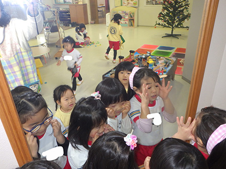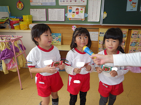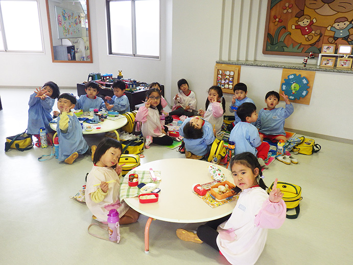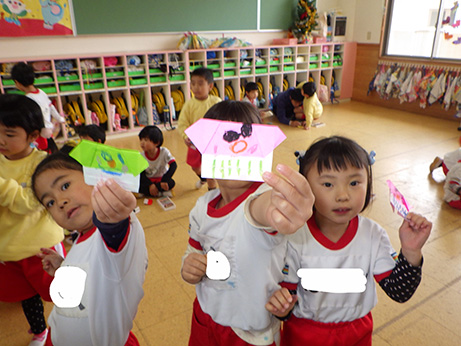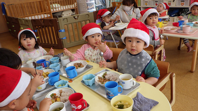 今日も元気に登園。  さんぽぐみさんは、大きな画用紙にお絵描き。 いろんな色を使って、楽しそうに描いていましたよ。  鏡に向かって、にらめっこ。 相手は自分?!  わくわくルームではポケモン。 ルールを決めて、遊んでいましたよ。 今日は2学期最後の英語教室。  今日のラッキーさんは誰かな?  どきどきしますね〜  今日のラッキーさん。 「I'm Happy.」 も大きな声で言えました。  2学期の作品を思い出ホルダーに綴じました。  こんなのもつくったね〜 と思い出しながら。  2学期の思い出がいっぱいです。 他にも・・・  ことりぐみさんは迷路あそび。 集中して頑張っていましたよ。  ひかりぐみさんは絵本のシール貼り。 キャビンアテンダントのお手伝いをしました。  ほしぐみさんは、ししまいの顔を描きましたよ。 上手でしょ? 木曜日はお弁当。 第2回、シャッフルランチです。  「いってきま〜す」 今日はお部屋以外で食べてもいいよ。 ということで・・・  おゆうぎ室のステージでクリスマスツリーを囲んで。  ひかりぐみのお部屋にはことりぐみさんがいっぱい。  ことりぐみはこんな感じ。  玄関ホールは意外と人気でした。  テラスで食べるお友だちも。 「ぜんぜんさむくないよ」 と言いながら、楽しそうに食べていましたよ  もうすぐクリスマスということで  お弁当の中もサンタさん🎅がいっぱいでした。 幼稚園は明日2学期の終業式です。 正装での登園をお願いします。 はじめちゃんは・・・  お店屋さんごっこをしました。 嬉しそうに買い物をするはじめちゃんたち。  さんぽぐみさんも、がんばって 「いらっしゃいませ〜」 と売っていました。  そのあとはさんぽぐみさんもお買い物。 たくさん買って、満足そうでしたよ。  今日はサンタの帽子をかぶって、給食を食べました。  パーティー気分でとても嬉しそうでしたよ。 ☆今日の給食☆  千草焼き 筑前煮 ごはん すまし汁 デザート 今日もおいしくいただきました。 明日も元気に登園してくださいね。