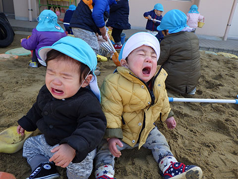 砂場ではいっぽぐみの男の子2人が同時に泣き出し