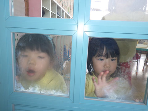「ハーッ」と息を吹きかけてお絵かきする姿も。