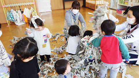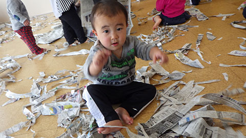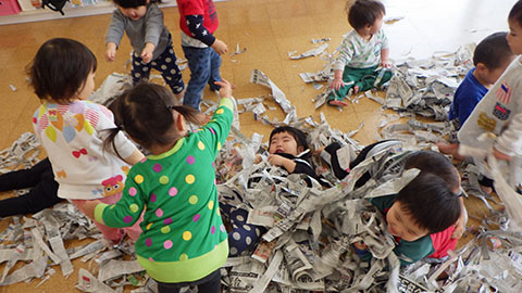 新聞紙を掛け合ってみたり、たくさん集めて投げてみたりと