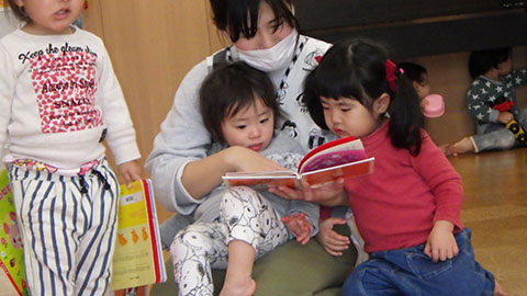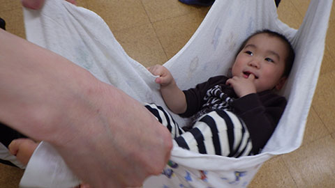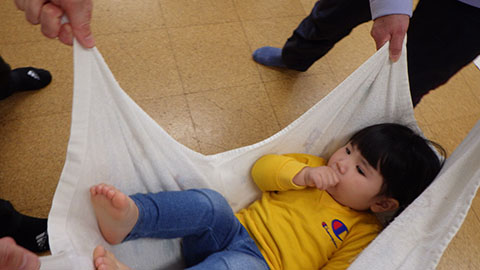 大きな布に寝転がって、先生たちにゆっくり揺らしてもらいました。
