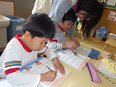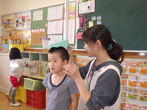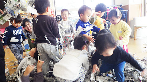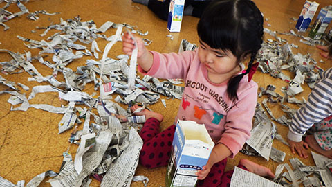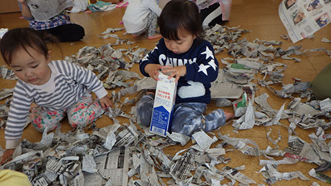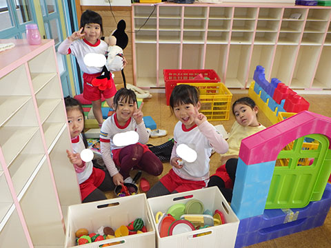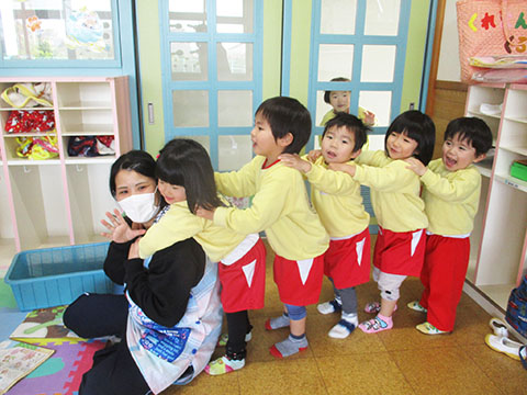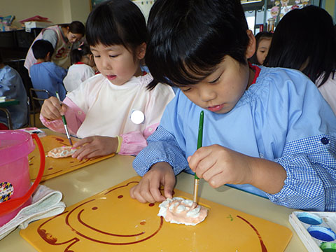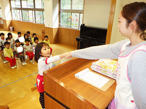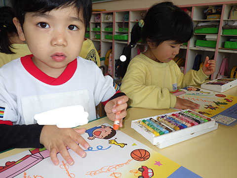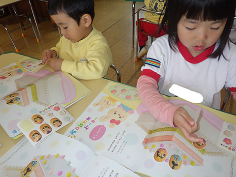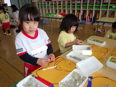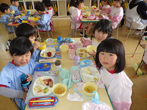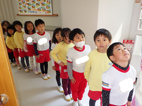 今日も元気に登園。  ひかりぐみさんが幼稚園で過ごすのもあと少し。  みんなで仲良く遊んでいましたよ。  ことりぐみのHちゃんは、粘土で美味しそうな パンを作ってくれました。  ひかりぐみさんの卒園製作も着々と進行中です。 おはじまりは・・・  ことりぐみさんは身体測定。 1年間で身長もずいぶん伸びました。  クレパスのおけいこは 「びっくりばこ」 クルクルの線を上手に描いていましたよ。  絵本のシール貼りも楽しそうに取り組んでいました。 ほしぐみさんは  せんのおけいこ。 もうすぐ年長さんになるので、  ひらがなに似た形をかきましたよ。 みんなとっても上手でした。 ひかりぐみさんは  粘土で作った自分の顔を絵の具で塗りました。 卒園製作ももうすぐ完成です。 気持ちを切り替えて  おゆうぎ室で卒園式の練習。  証書を受け取る練習を頑張っています。  給食はミートローフ。 野菜ももりもり食べました。 明日幼稚園の昼食はサンドイッチパーティーです。 パンの準備をお忘れなく。 はじめちゃんは・・・ いっぽさん、にほさんは  新聞あそびをしました。 今日は、牛乳パックに新聞をたくさん詰めましたよ。  ギュッギュッ・・・と力を入れて・・・。  新聞を真ん中に集めて投げると みんな大喜びでした  さんぽぐみさんは  朝から 「おおきなかぶごっこ」 を楽しんでいました。 前のお友だちにくっついて、 かぶ役の先生を、歌をうたいながら 「うんとこしょ、どっこいしょ」 うまく抜けたかな?  大型ブロックでダイナミックに遊ぶ姿も。 高く重ねたブロックに登ったり  ベットに見立てて寝転んだり・・・。 いろんな遊び方を考えて楽しんでいました。 ☆今日の給食☆  ミートローフ コロコロポテトサラダ ごはん スープ デザート 今日もおいしくいただきました。 明日も元気に登園してくださいね。