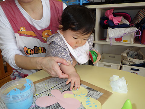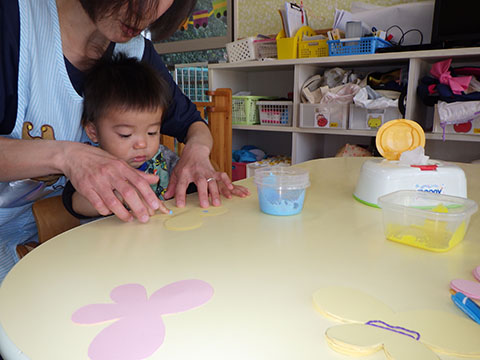 ちょうちょの形の画用紙に、小さな指で絵の具をトントン