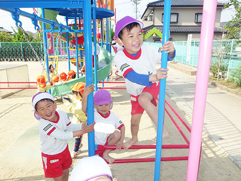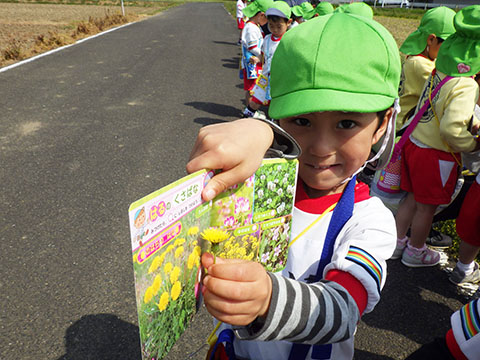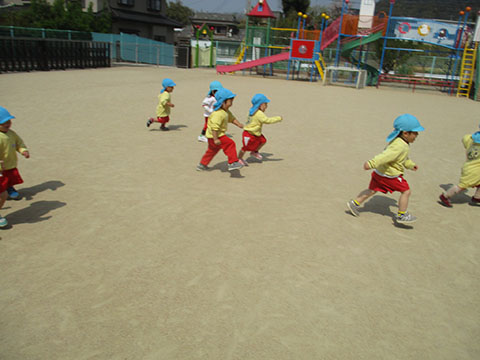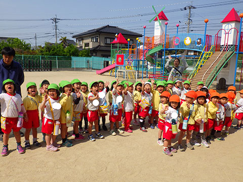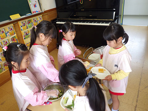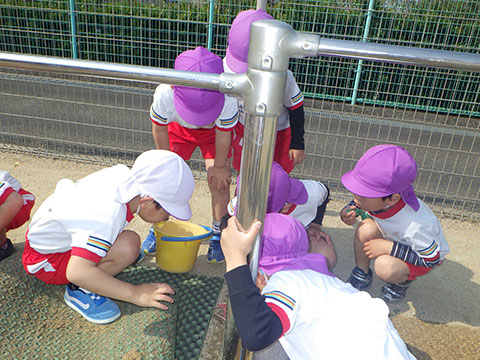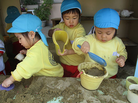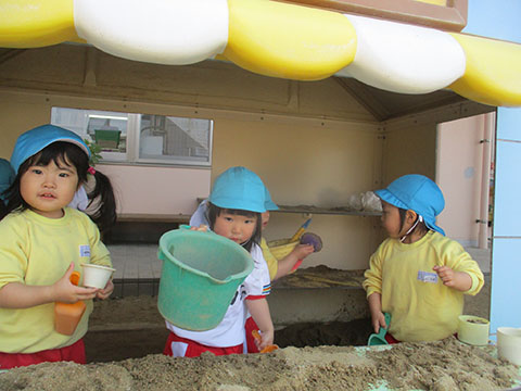 お友だちと一緒に砂をたくさんバケツに入れていました。