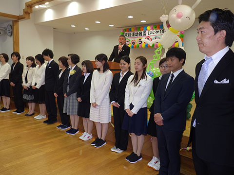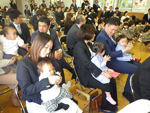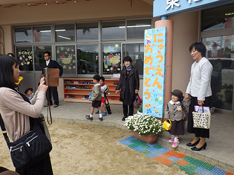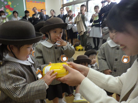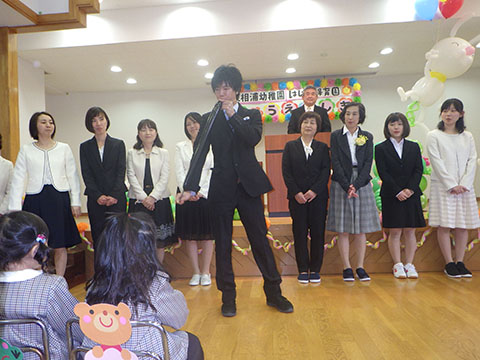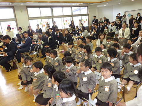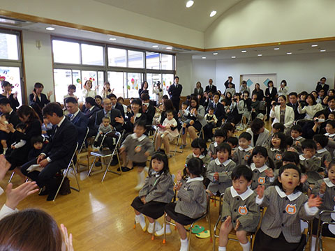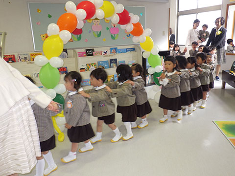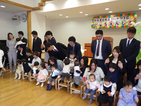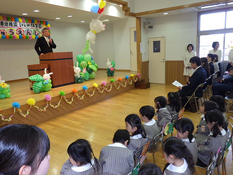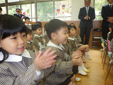 平成31年度 東相浦幼稚園 はじめ保育園の 入園式が行われました。 会場の準備も万端。  汽車ポッポで上手に移動中。  おゆうぎ室に集合。  はじめ保育園のお友だちも、お父さんやお母さんと 一緒に着席。  少し緊張しているかな?  園長先生のお話。 みんな静かに聞くことができました。  職員紹介。 1年間よろしくお願い致します。  H先生の特別パフォーマンスも。  「すご〜い!!」 と喜んでくれました。  みんなで歌も歌いました♪  はじめちゃんたちも、手を叩きながら がんばっていました。  最後は記念写真撮影。  ことりぐみさんとほしぐみさんは 準備ができるまで、手あそびでリラックス。  無事に記念写真が撮れました。  お部屋ではお土産をもらってにっこり笑顔  解散後は  思い思いに写真を撮る姿が・・・。  「あなたなんセンチ?」 にほぐみのRちゃんとMちゃん。 とてもかわいかったです💛 幼稚園は明日からますます賑やかになりますね。 新しいお友だちも元気に登園してください。 それではまた明日・・・。