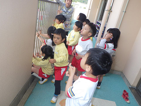 ベランダから園庭のこいのぼりを観察。