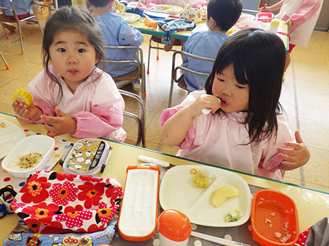 新しいお友だちもがんばって食べていました。