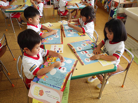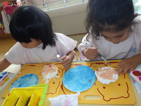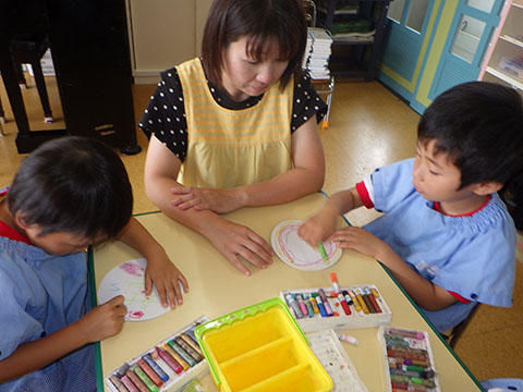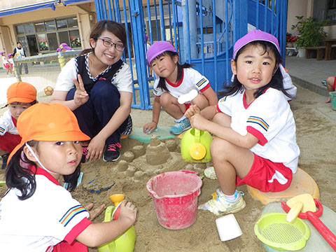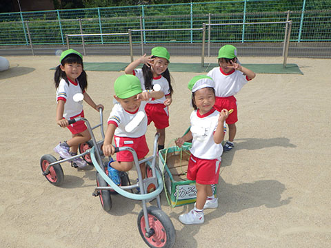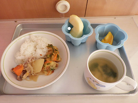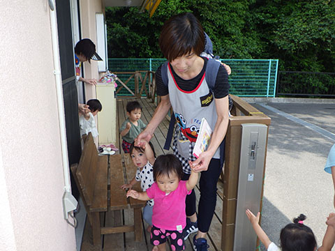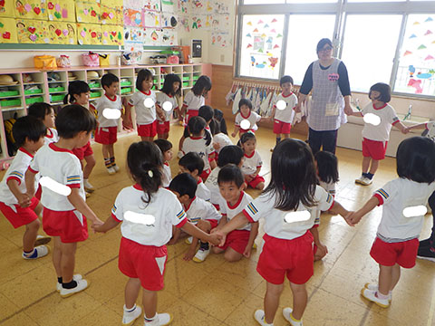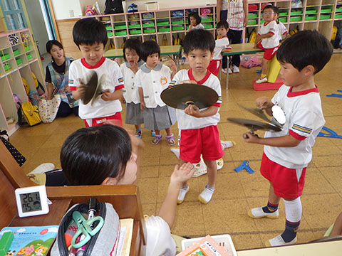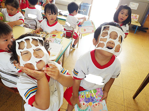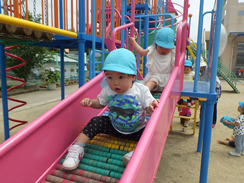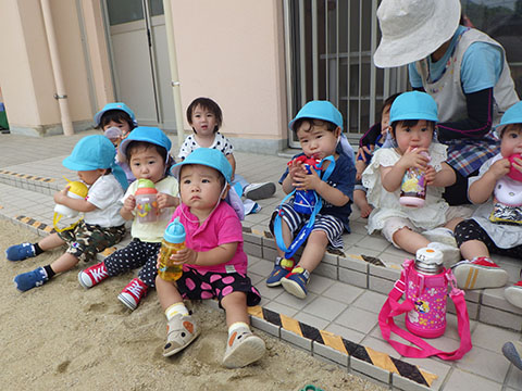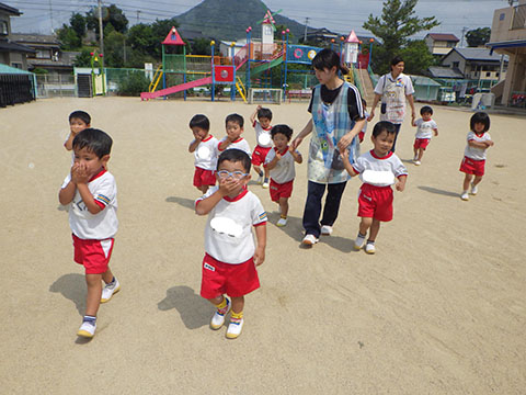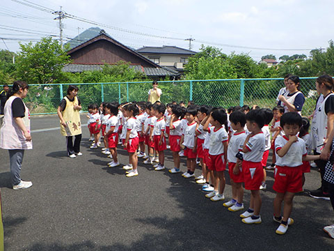 今日も元気に登園。  ひかりぐみさんは、マーチングのパート練習が 始まっています。  今日もいいお天気だったので、 元気にお外へ・・・。  砂場は今日も大混雑でした。 幼稚園、保育園合同で  避難訓練をしました。  口を押えて、慌てずに・・・。  避難用すべり台も使いました。  無事に全員避難完了。  さんぽぐみさんもきちんと話を聞いていました。 避難訓練後・・・  ことりぐみさんは、絵本のシール貼り。 てるてる坊主のシールでした。  貼り終わると、余ったシールを顔にぺったんこ。 やっぱりこうなりますね   ほしぐみさんもシール貼り。 カエルとカタツムリでした。 最近生き物に興味津々なので、 とっても嬉しそうでしたよ。  みんなでゲームも。 とっても盛り上がっていました♪  ひかりぐみさんは父の日製作。  先日紙粘土で作った顔に絵の具で色塗りも。 2回目なのでスムーズに進めていましたよ。  今日は給食試食会がありました。 普段子どもたちが食べている給食です。  栄養士の先生に質問も。 「おいしかったです」 と言っていただきました。 はじめちゃんは・・・  避難訓練の後すべり台で遊びました。  遊んだあとは、みんなで水分補給。 とっても楽しそうでした。 ☆今日の給食☆  ごはん 肉じゃが 納豆のかき揚げ おかか和え すまし汁 デザート 今日もおいしくいただきました。 明日も元気に登園してくださいね。