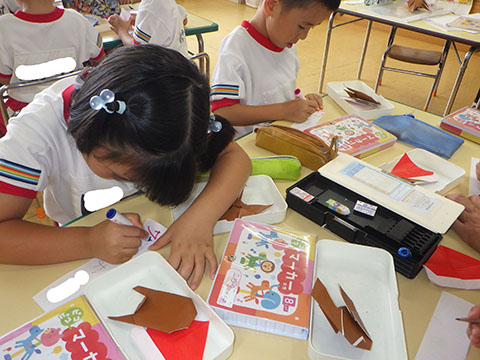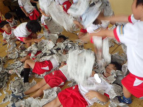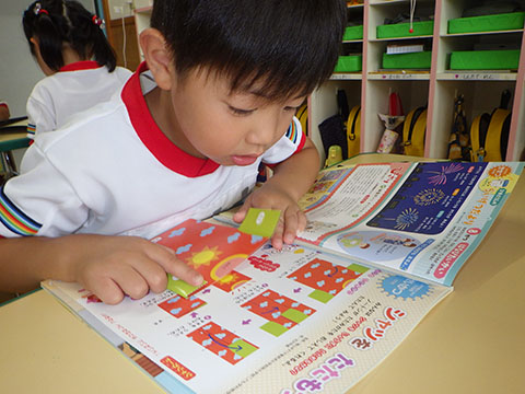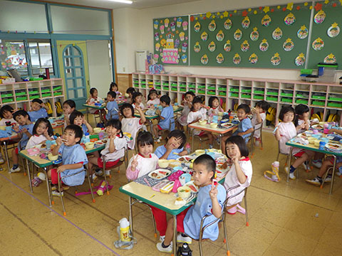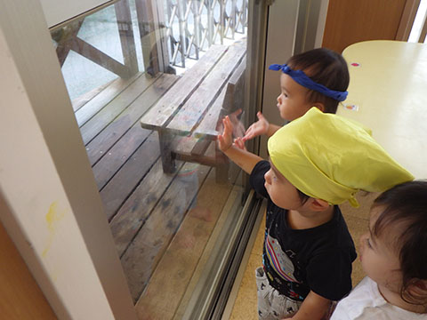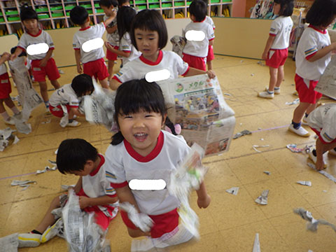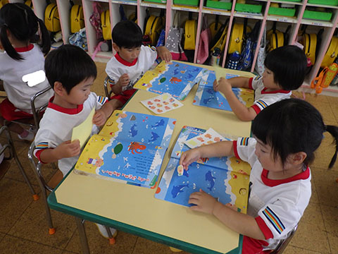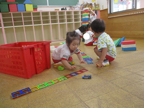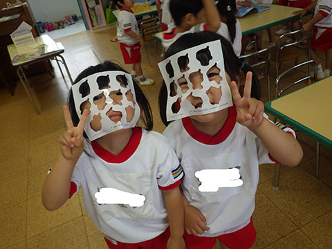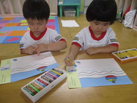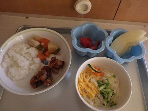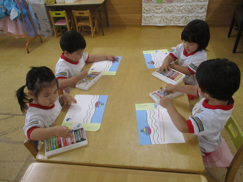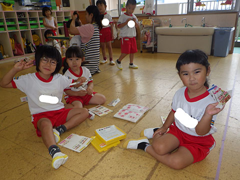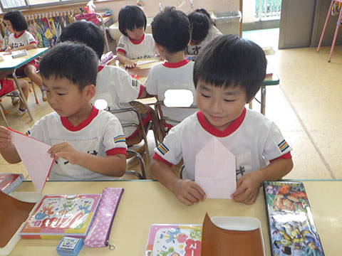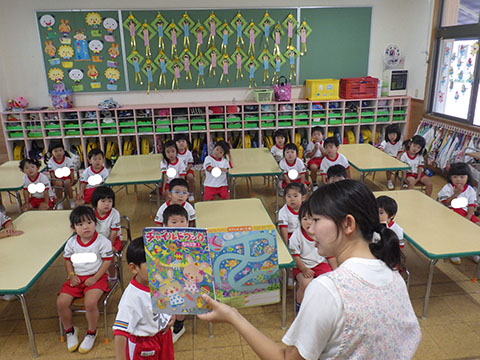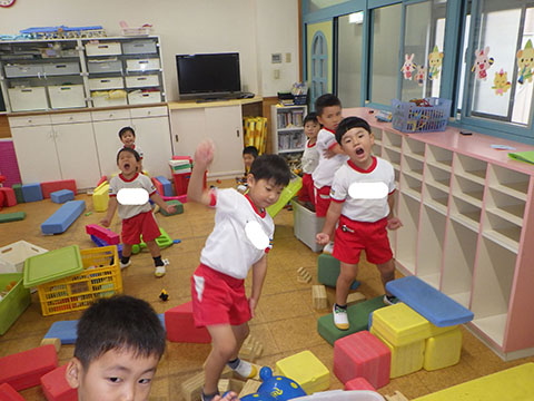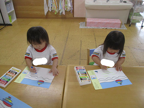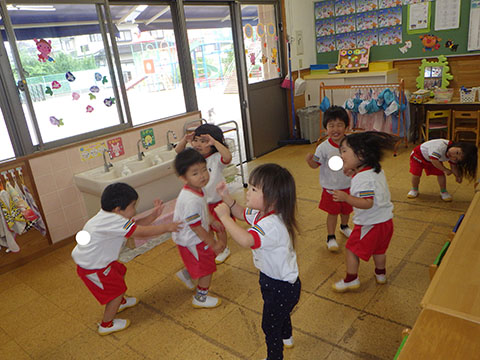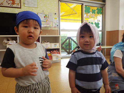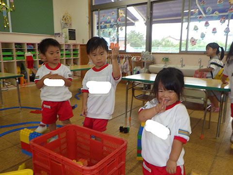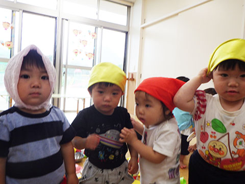 今日も元気に登園。  お天気が悪かったので、室内あそび。  さんぽぐみさんは楽しそうにダンス♪  仲良く遊んでいましたよ。 おはじまりは・・・  ことりぐみさんは、7月の絵本。 先生に読んでもらったあとは・・・  シール貼りをしました。  終わったあとは、やっぱりこんな顔に  毎月のお楽しみです。  ほしぐみさんは新聞あそび。  お部屋にいっぱい新聞を広げて、 すご〜く楽しそうでしたよ。  ひかりぐみさんはおりがみ製作。 クワガタとすいかです。  名前も自分で書きました。 仕上げはまた今度・・・。  月間絵本も。 Tシャツの畳み方を確認しました。  給食は、みんなの大好きなから揚げ。 モリモリ食べました。 明日はほしぐみとことりぐみのプールです。 準備をよろしくお願いします。 はじめちゃんは・・・ いっぽさん、にほさんは  布を頭や手首に巻いて、ままごとをしました。  カメラを向けると、集まって来てくれましたよ。  外にいるバスの運転手さんに 「お〜い」 とにこにこ笑顔で手を振る姿がかわいかったです   さんぽぐみさんはクレパスのおけいこ。  「なにいろ〜?」 と確認したり  「こうよね〜」 と話しながら描いていましたよ。 終わってからは  わくわくルームへ。 お気に入りのおもちゃをみつけて 遊んでいました♪ ☆今日の給食☆  ごはん から揚げ がめ煮 七夕そうめん デザート 今日もおいしくいただきました。 明日も元気に登園してくださいね。