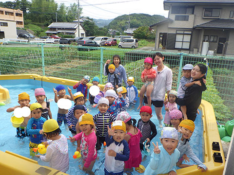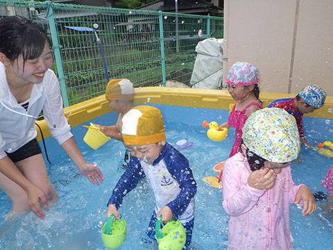 プールに水が溜まる様子を、嬉しそうに見ていたことりぐみさん。