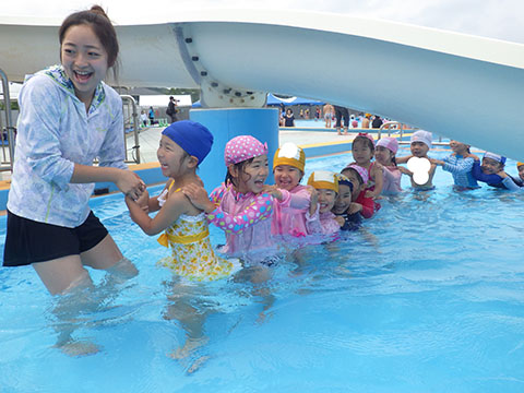 汽車ポッポで広いプールの中を探検。