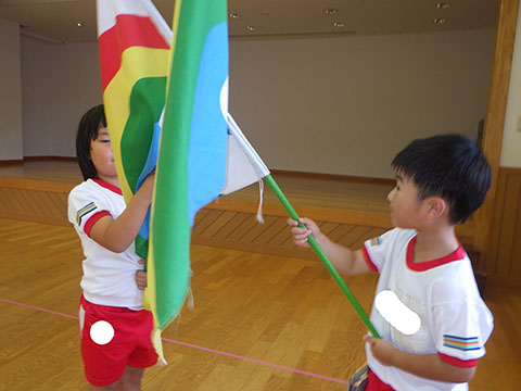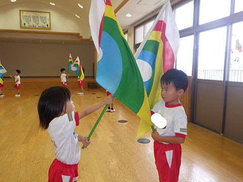 カラーガードさんはおゆうぎ室で練習。