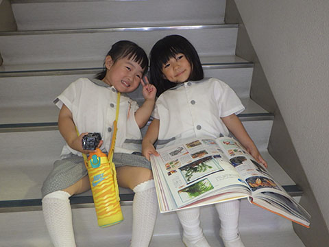 階段で仲良く絵本を読んでいた2人。