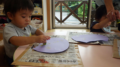 自分で絵の具をつけてトントントン。