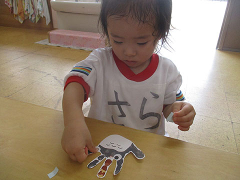 うちわ用のトトロに目のシールを貼りました。