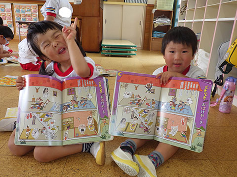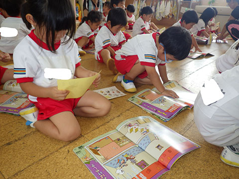 月間絵本のシール貼りも。