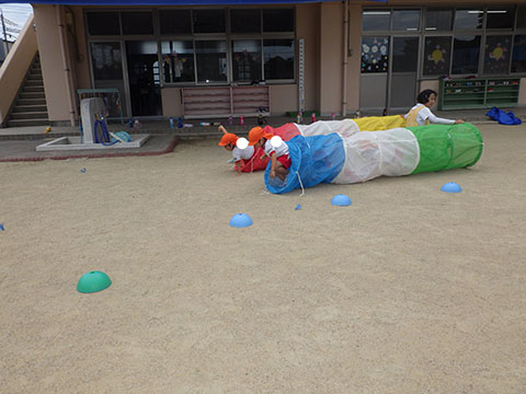 ことりぐみさんは園庭でトンネルくぐりや
