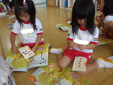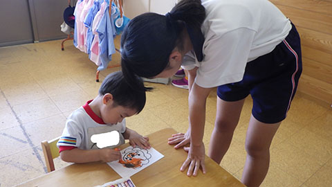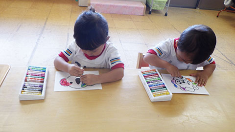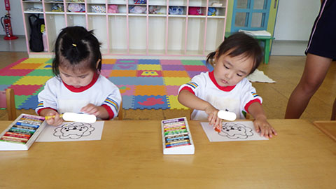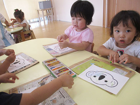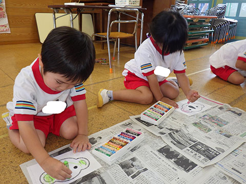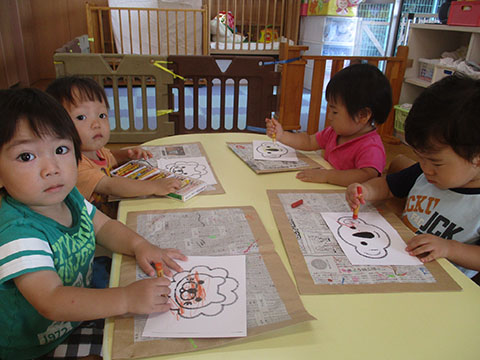 運動会の親子おゆうぎで使う動物のお面に色を塗りました。