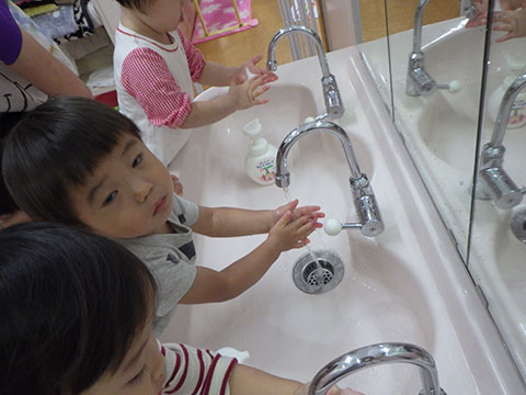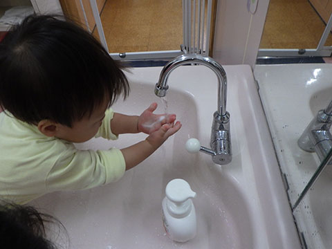 手洗いも上手になり、自分で泡せっけんをつけて