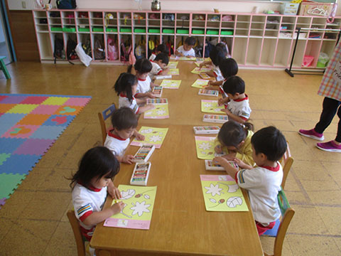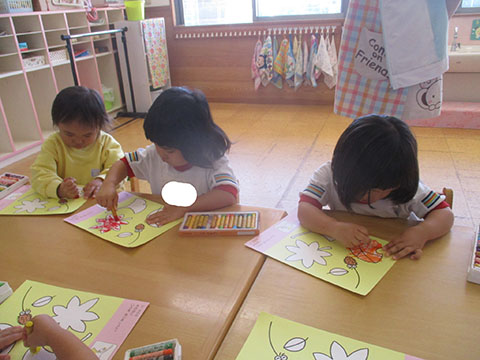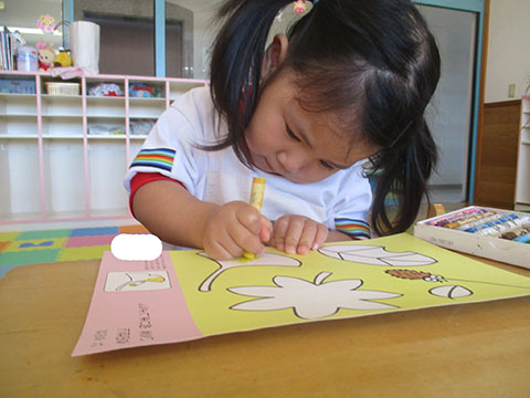 クレパスのおけいこで葉っぱの色塗りをしました。