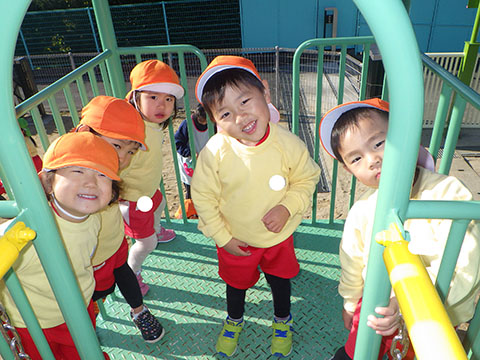 すべり台にのぼって楽しそうなことりぐみさん。