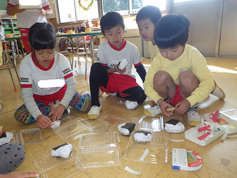 ひかりぐみさんは手分けしてお弁当のおかずやおにぎり作り。