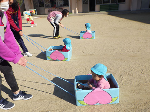 運動会で使った桃太郎の船で園庭をお散歩。