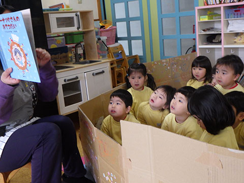 ハッピーハウスの中で静かに絵本をみているさんぽぐみさん。