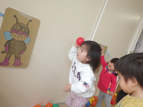 壁に貼ってあるバイキンマンなどのキャラクターに向かって