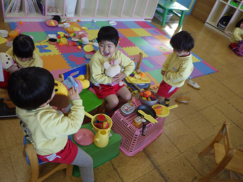 女の子の真似をして、ごっこ遊びを楽しんでいた男の子たち。