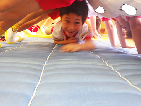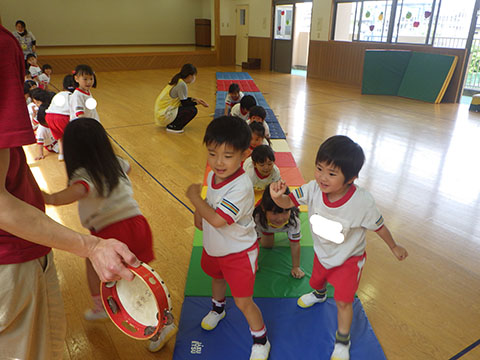 ハイハイで進んだ後、ゴールでタンバリンをたたきました。