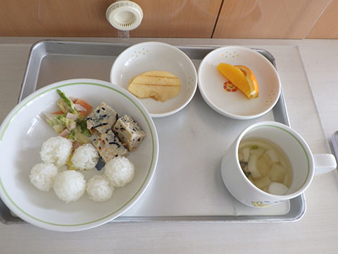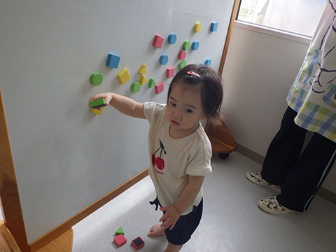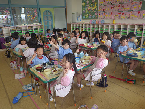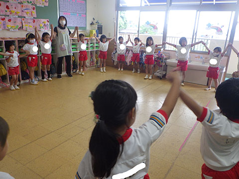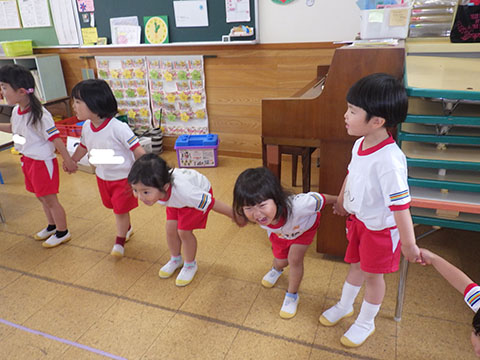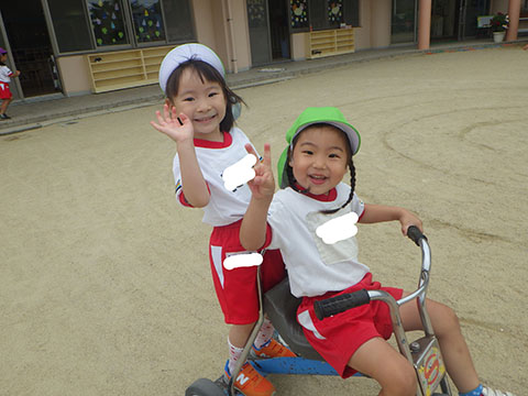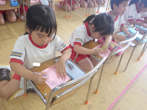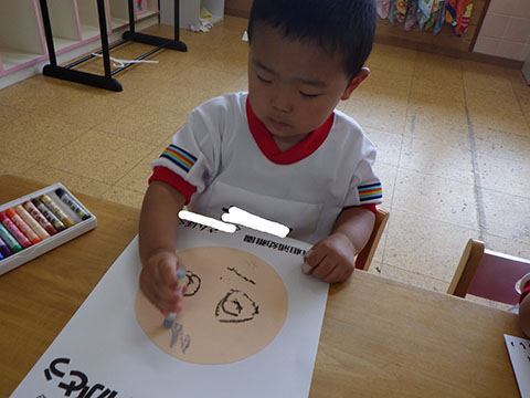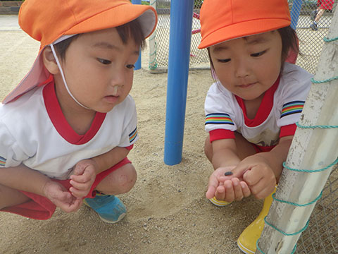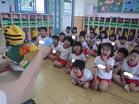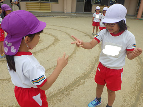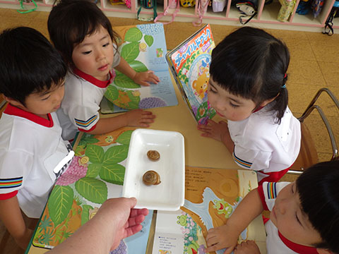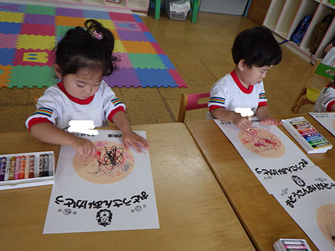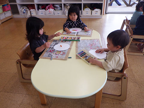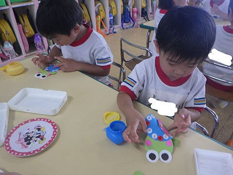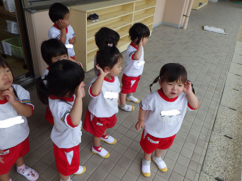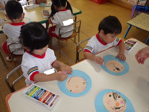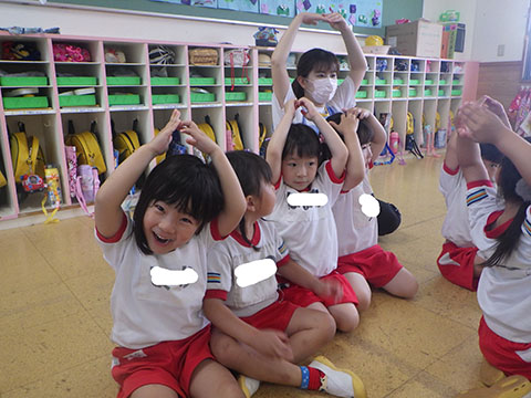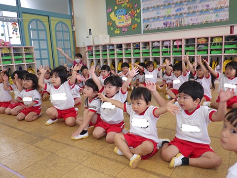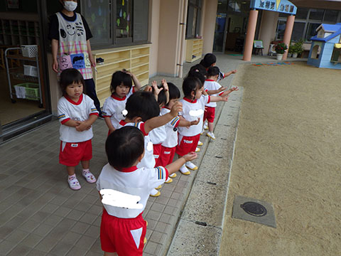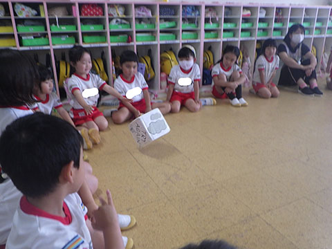 今日も元気に登園。 お外でぐるぐるドンじゃんけん!!  仲良くダンゴムシの観察。  三輪車も2人で乗ると楽しさ2倍です。 今日は今年度1回目の英語教室がありました。  まずはしまじろうに 「Hello!!」  お友だちにも 「Hello!!!」  〇や△、□も。  ひかりぐみさんは Up&Down  お天気は・・・ Sunny☀  お天気サイコロ。 出た目を見て、大きな声で Cloudy  これからいろんなことを覚えていきましょうね。 他にも・・・  ことりぐみさんは父の日製作。 顔の描き方もずいぶん上手になりました。  6月号の絵本のお話にカタツムリが出てきました。 本物を先生に見せてもらって、興味津々でしたよ🐌  ほしぐみさんは、時計製作のつづき。 かわいいカエルの時計が、もうすぐ完成です。  ひかりぐみさんも時計製作。 文字盤に数字を書きました。 ゆっくり、丁寧に。 とっても上手でしたよ。  給食ももりもり食べました。 おいしかったです。 幼稚園は明日、ブラッシング指導があります。 歯ブラシと手鏡をお忘れなく。 はじめちゃんは・・・ にほぐみさんは  クレパスでお絵かきでした。 みんなイスに座って取り組みましたよ。  その後は、玄関ホールで遊びました。  みんな仲良く遊んでいました   たくさん遊んで、一足先に夢の中・・・  さんぽぐみさんは 朝のおはじまりをしていると・・・  雨が降ってきました。 みんなで雨の音を聞いたり  手を伸ばして、雨の感触を楽しんでいましたよ。 その後・・・  父の日の絵を描きました。  まつばやさんに飾られる予定です。 ☆今日の給食☆  ごはん ひじきつくね キャベツとハムのサラダ すまし汁 デザート 今日もおいしくいただきました。 明日は歯科検診があります。