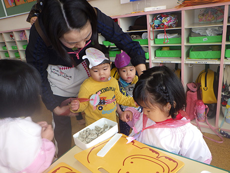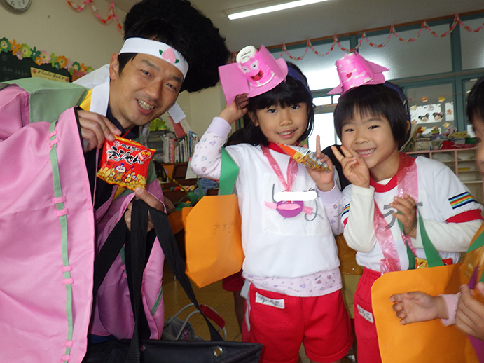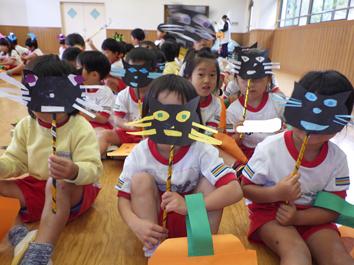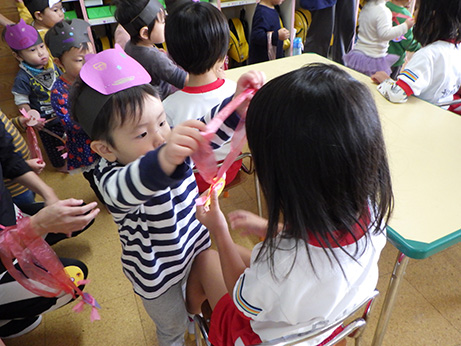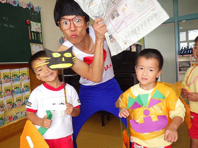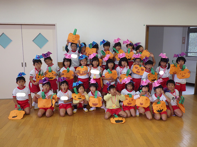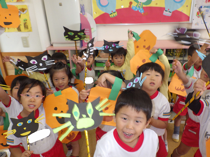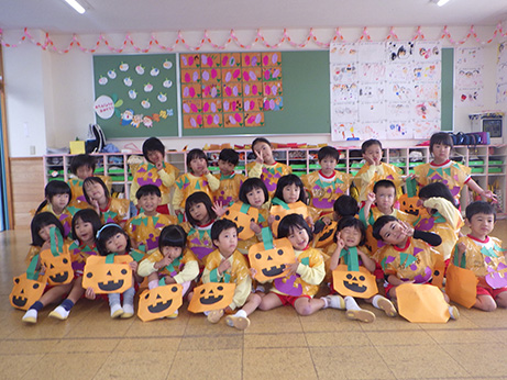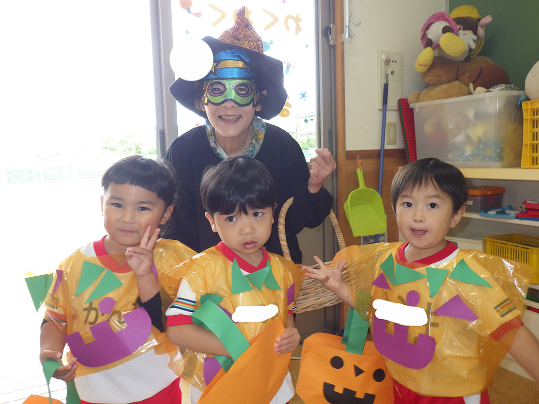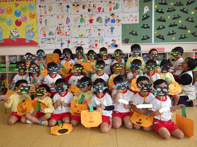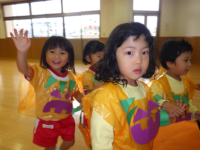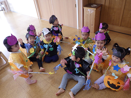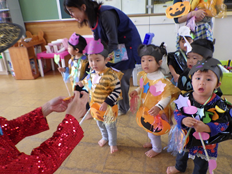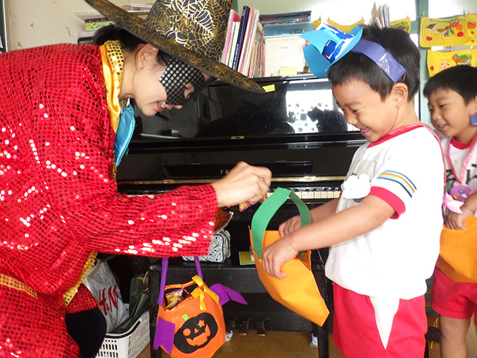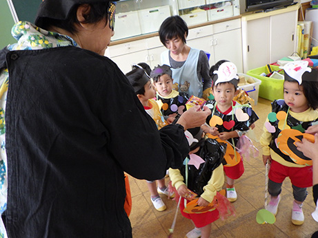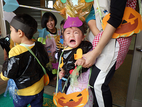 仮装する先生たちに驚いて泣く子もいましたが、みんなしっかりお菓子を手に握りしめていました