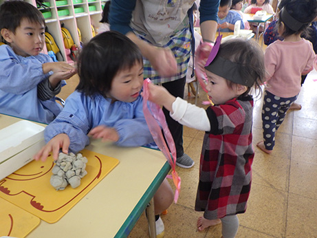 いっぽぐみ、にほぐみのお友だちは先日幼稚園のお友だちと一緒にハロウィンの衣装づくりをしたのでそのお礼を渡しに行きました