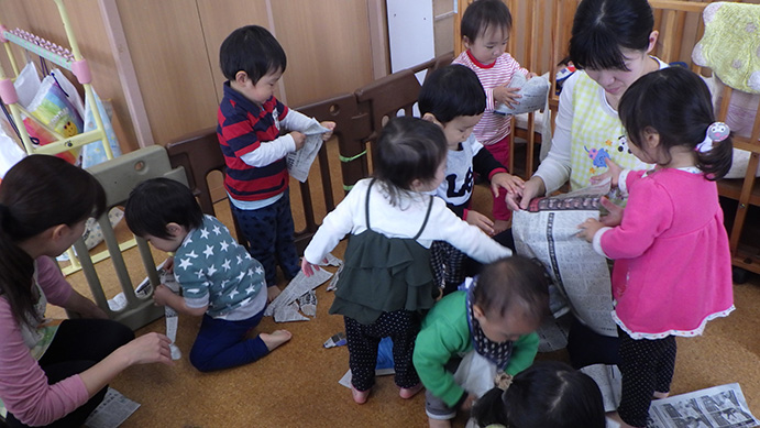 新聞紙をくしゃくしゃにして、感触を味わっていました。