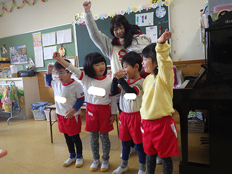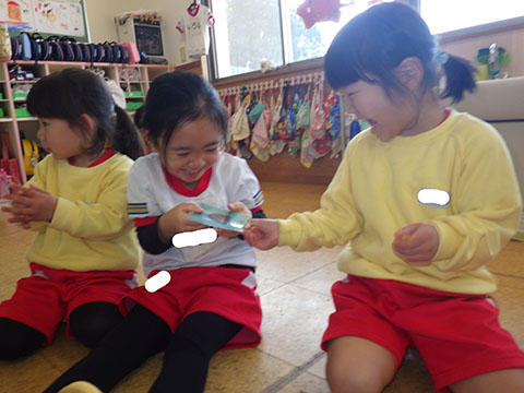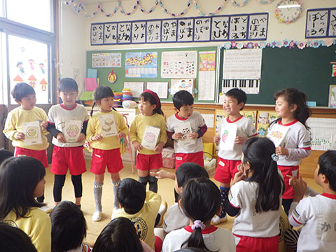 大きな声で言いながら笑顔でカードを隣のお友だちに