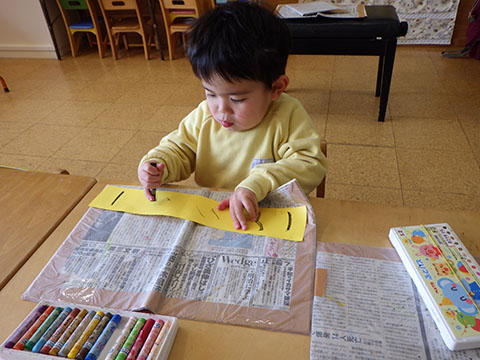 おにのパンツの模様をクレパスで描きましたよ。