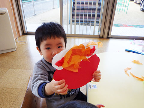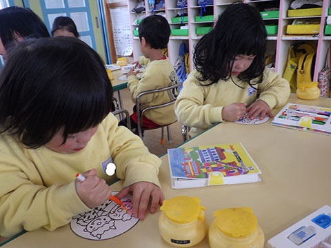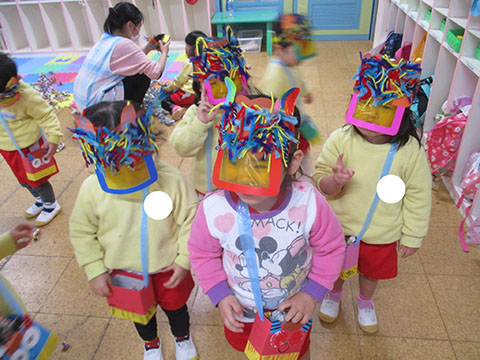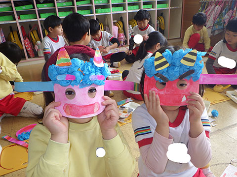 ひかりぐみさんはおにのお面の仕上げ。