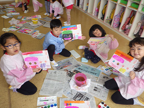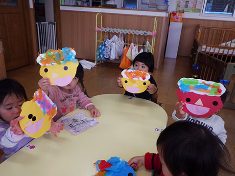ひかりぐみさんは絵の具で、鬼のお面作り。