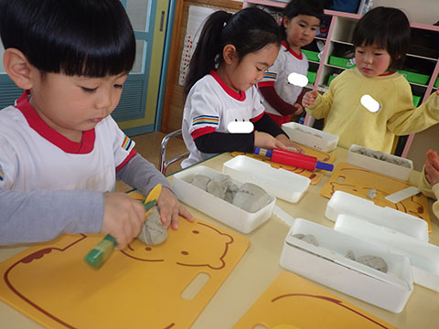 ことりぐみさんは、新しいグッズを使って粘土遊び。