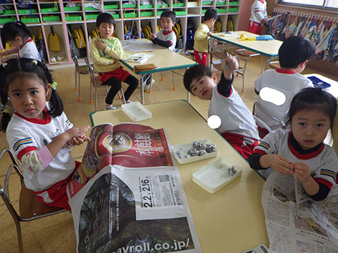 豆まきに向けて、新聞豆つくりも。