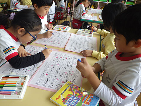 鍵盤ハーモニカの楽譜に色塗りも。
