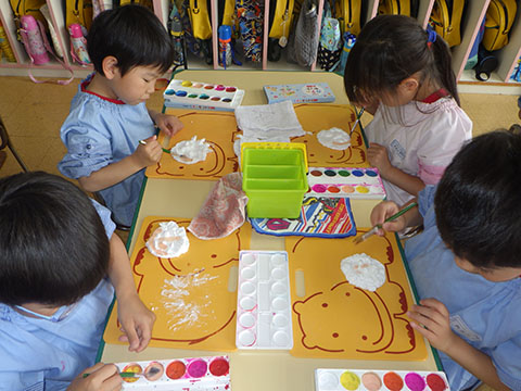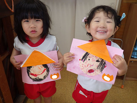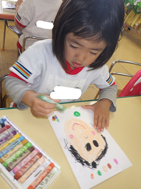 白い粘土で作った顔に、絵の具で色を塗りました。